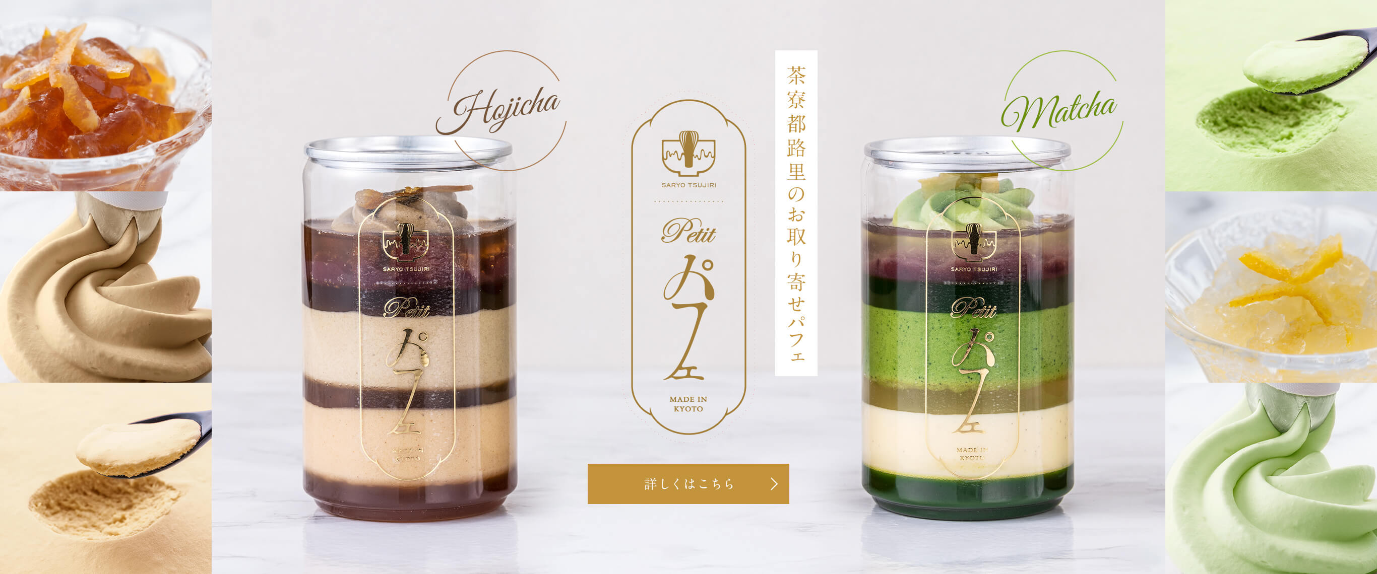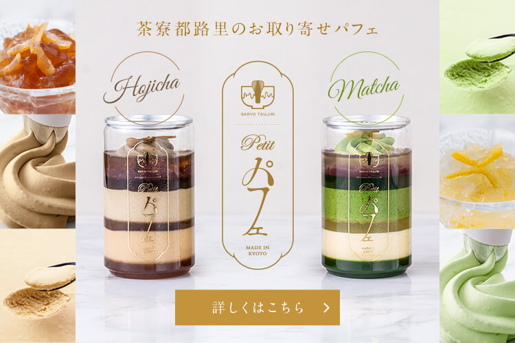 祇園辻利自慢の石臼挽き抹茶や、香り高くコクのあるほうじ茶を贅沢に使用。それぞれのお茶の持つ風味に合う素材を厳選し、 相性とバランスを究極まで追求した一品です。 -