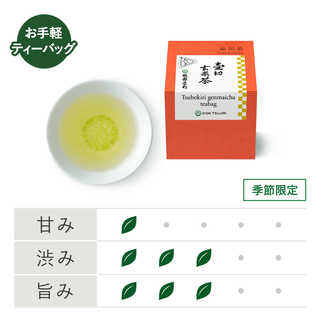 じっくりと熟成された壷切茶に、炒り玄米の香ばしさが絶妙に調和した「壷切玄米茶(つぼきりげんまいちゃ)」を、お手軽にお楽しみ頂けるティーバッグに仕上げました。口に含むと広がる”まろやかなうま味”の後には、煎茶らしいほのかな渋みと、あっさりとした玄米の味わいが追いかけてくるでしょう。さっぱりとした口当たりは、秋の味覚を楽しんだ後のお口直しにもちょうど良い一杯。