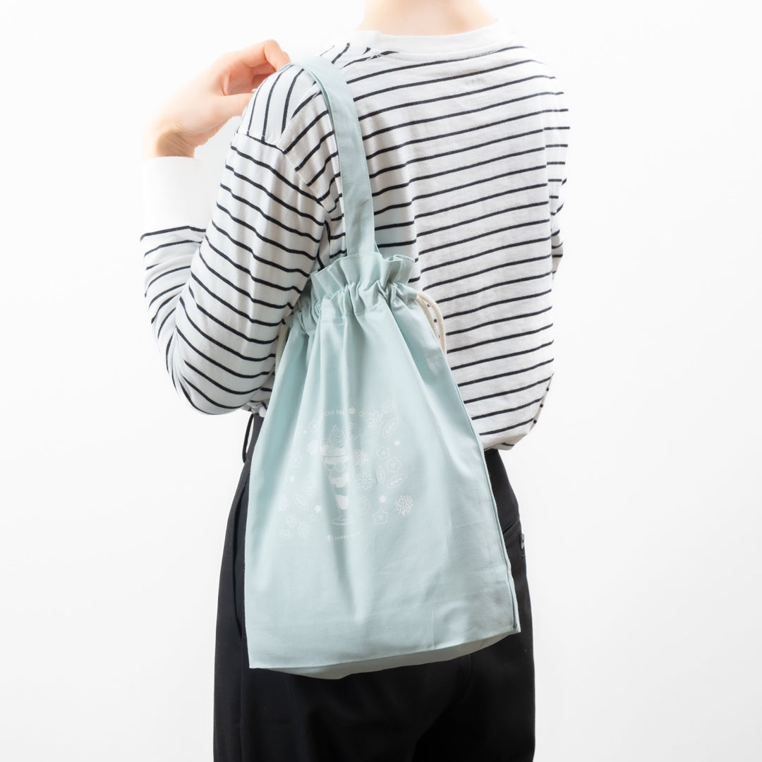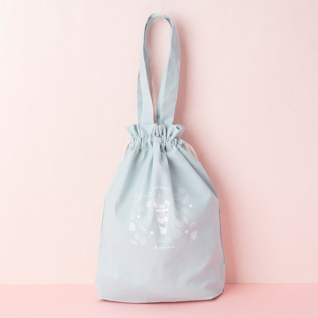 祇園辻利オンラインショップで大人気のオリジナルトートバッグ(非売品)が、春の限定のデザインで新登場。ころんとしたフォルムが愛らしい巾着タイプのトートに、京さくらが咲き誇る祇園の街並みをイメージし、茶寮都路里の人気メニュー「特選都路里パフェ」と花々をあしらったオリジナルデザイン。薄浅葱の上品な色合いと使いやすいサイズで、春のお出かけやランチバッグにもぴったりです。