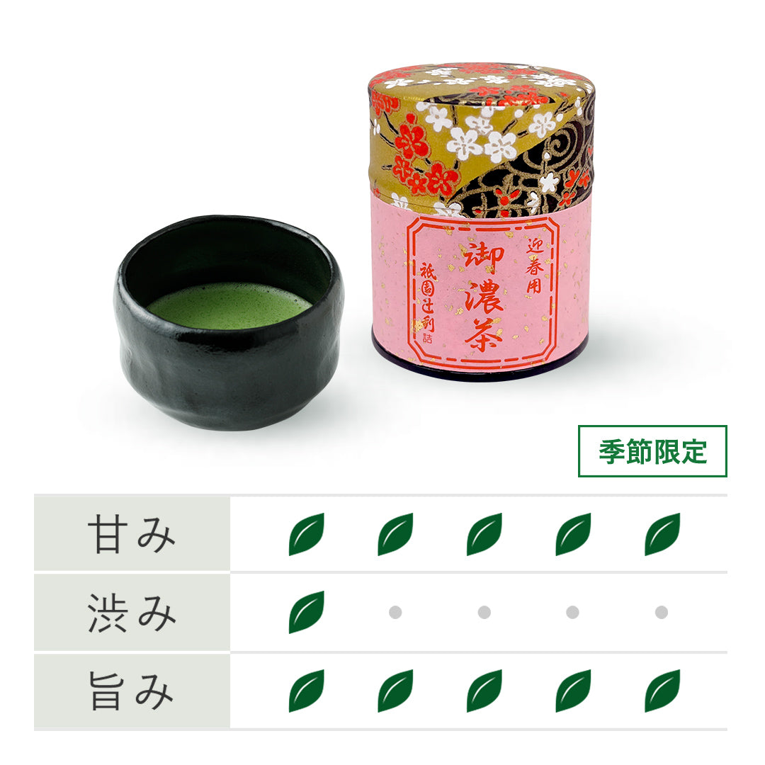 厳選した上質な碾茶を石臼で丁寧に挽き上げた抹茶は、封を開けたとたんに豊かな香りが鼻をくすぐります。お濃茶を口に含んだ際に広がる芳醇な甘い香りと、抹茶のコクを十分にお楽しみ頂けます。この時期だけのおめでたい迎春用の缶に入れて、ご用意しております。