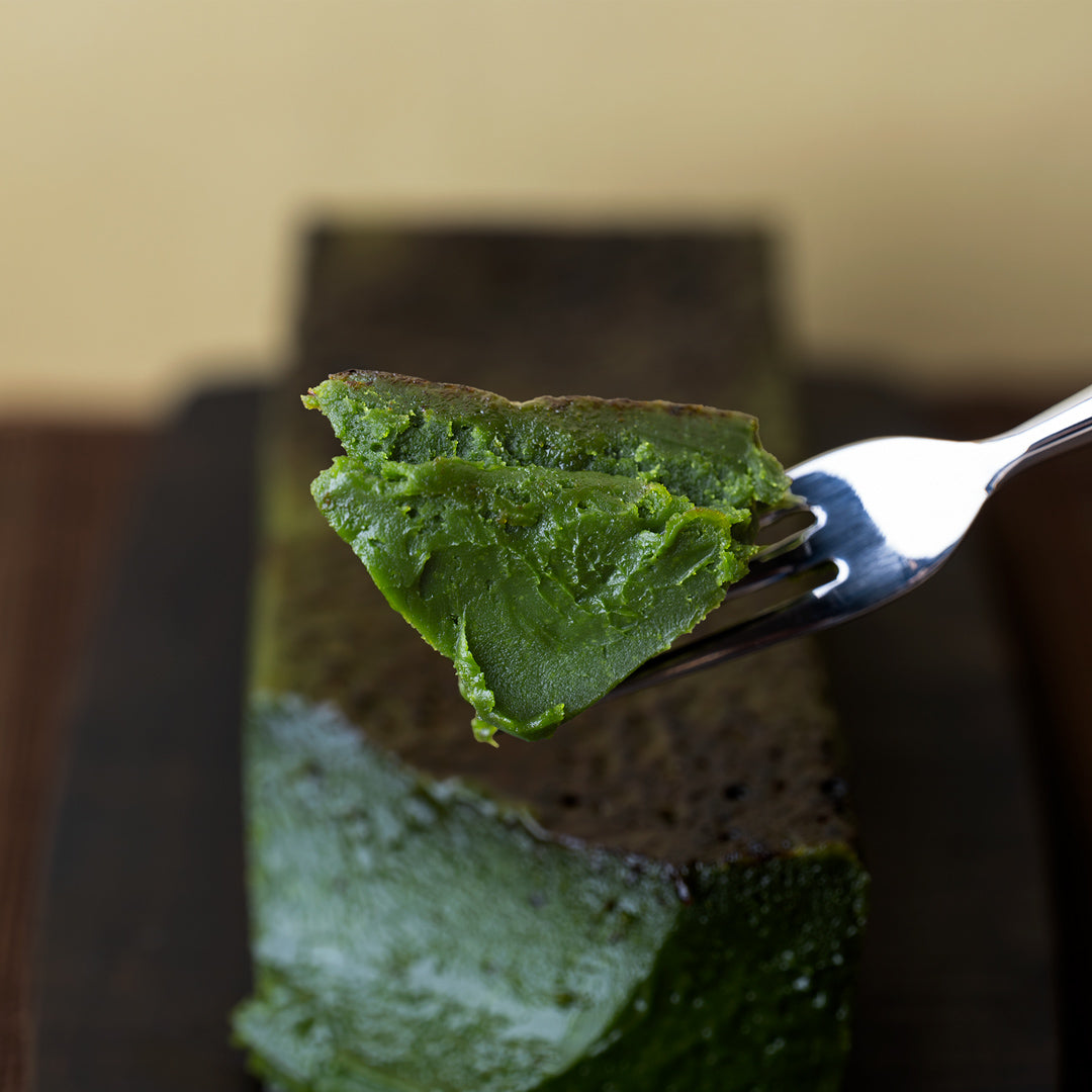 祇園辻利の抹茶テリーヌプレミアムは、非常に濃厚な味わい。カットは5mmほどの薄さがおすすめです。お届けは冷凍便にて。解凍後の温度によって味わいが変化しますので、お好みの風味・食感でお楽しみいただけます。