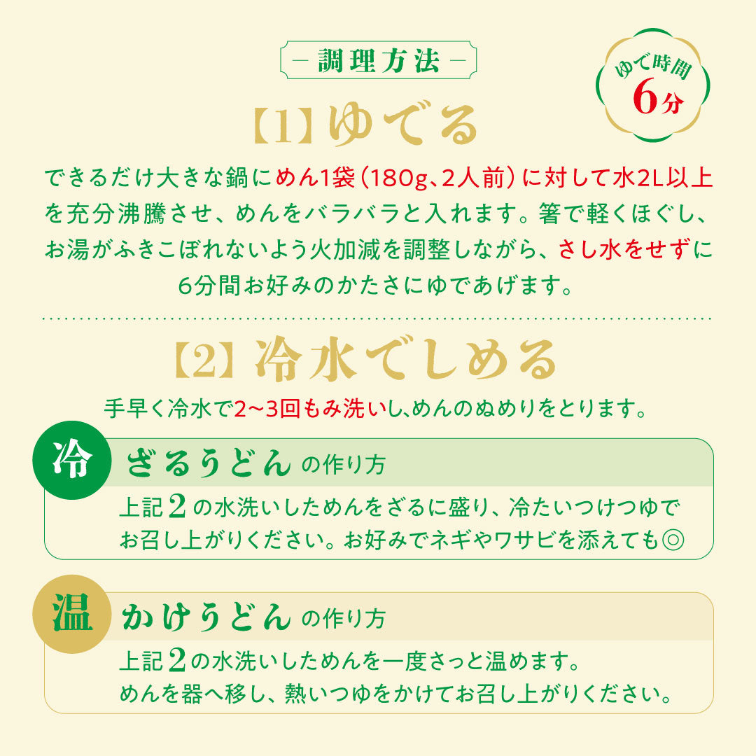 製麺は、老舗製麺所による「手打ち式包丁切製法」。讃岐うどん職人の手切りの繊細さを再現し、1本1本丁寧に細切り。角が立ったしっかりとしたコシと、つるりとした喉越しが魅力です。いつの時代にも、人の成せる技こそが、美味しさの原点なのです。
