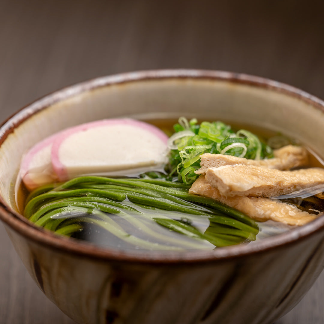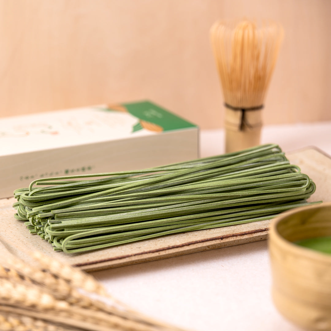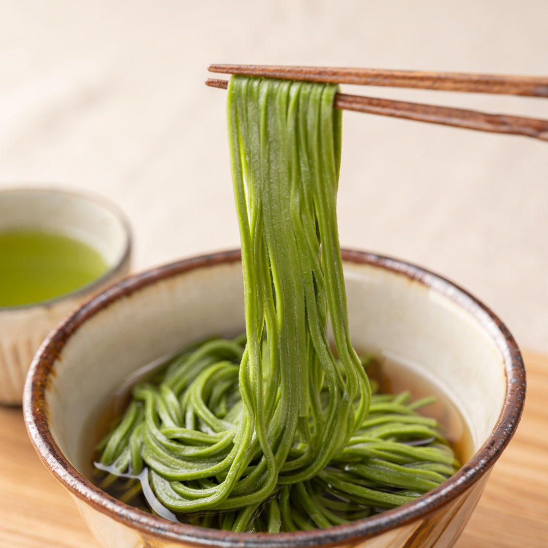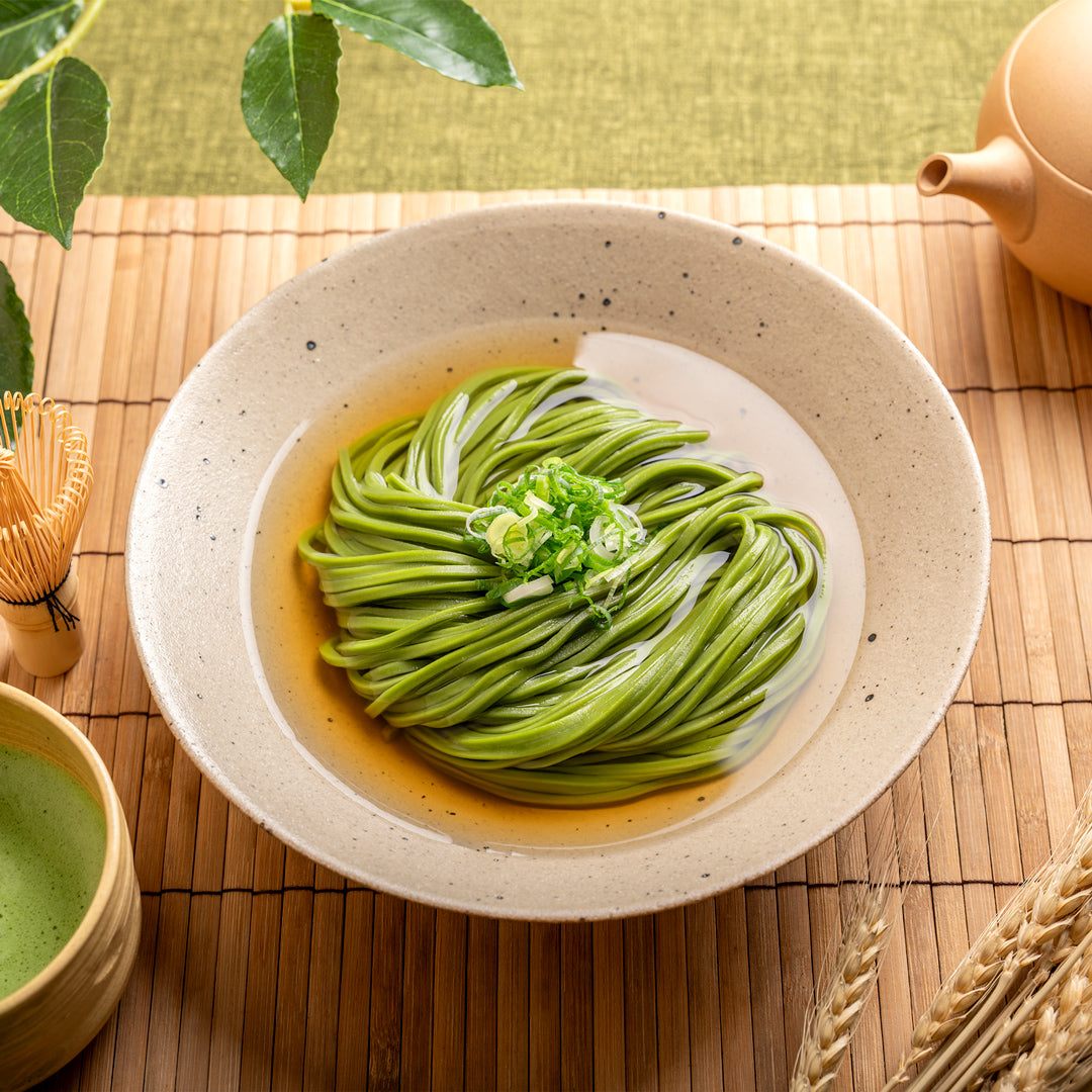 国産小麦の香りとコシを活かした細麺を、低温でじっくり2日間かけて乾燥。抹茶の香りがふわりと広がる、心地よい喉越しと食べ応えの絶妙なバランスを実現しました。抹茶の美しさと、伝統の技が織りなす、滋味深い一杯をどうぞ。