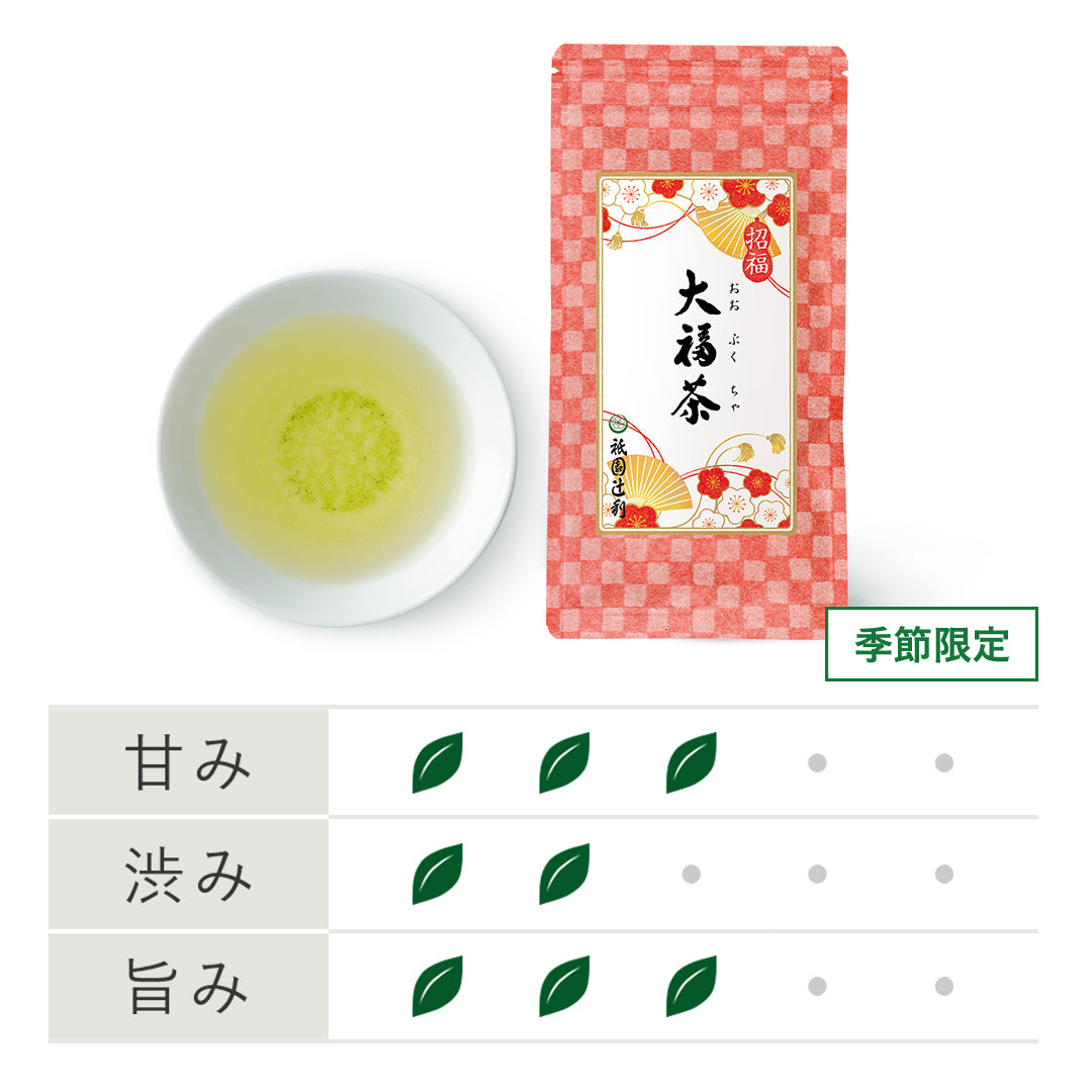 「大福茶」は、一年の無病息災を祈って元旦に頂く縁起の良いお茶のこと。茶舗によってさまざまな大福茶がございますが、祇園辻利の「大福茶」は上質な煎茶に玄米の花(玄米がはじけたもの、祝い花ともいわれる)を加え、風味豊かなお茶に仕上げています。口に含むと広がる”まろやかな甘みやうま味”の奥に、煎茶らしいほのかな渋みの余韻が感じられます。さっぱりとした口当たりは、初めて大福茶を飲む方にも最適なお茶です。